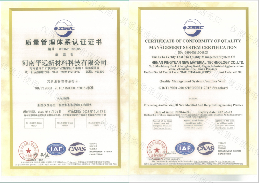 河南平遠新材料科技有限公司生產基地坐落于河南省鄢陵縣先進制造業開發區,工廠占地10000平方米。公司通過GRS全球回收標準認證、ISO9001質量體系、14001環境體系和45001職業健康安全管理體認證。華東分公司位于浙江省余姚市中國塑料城。